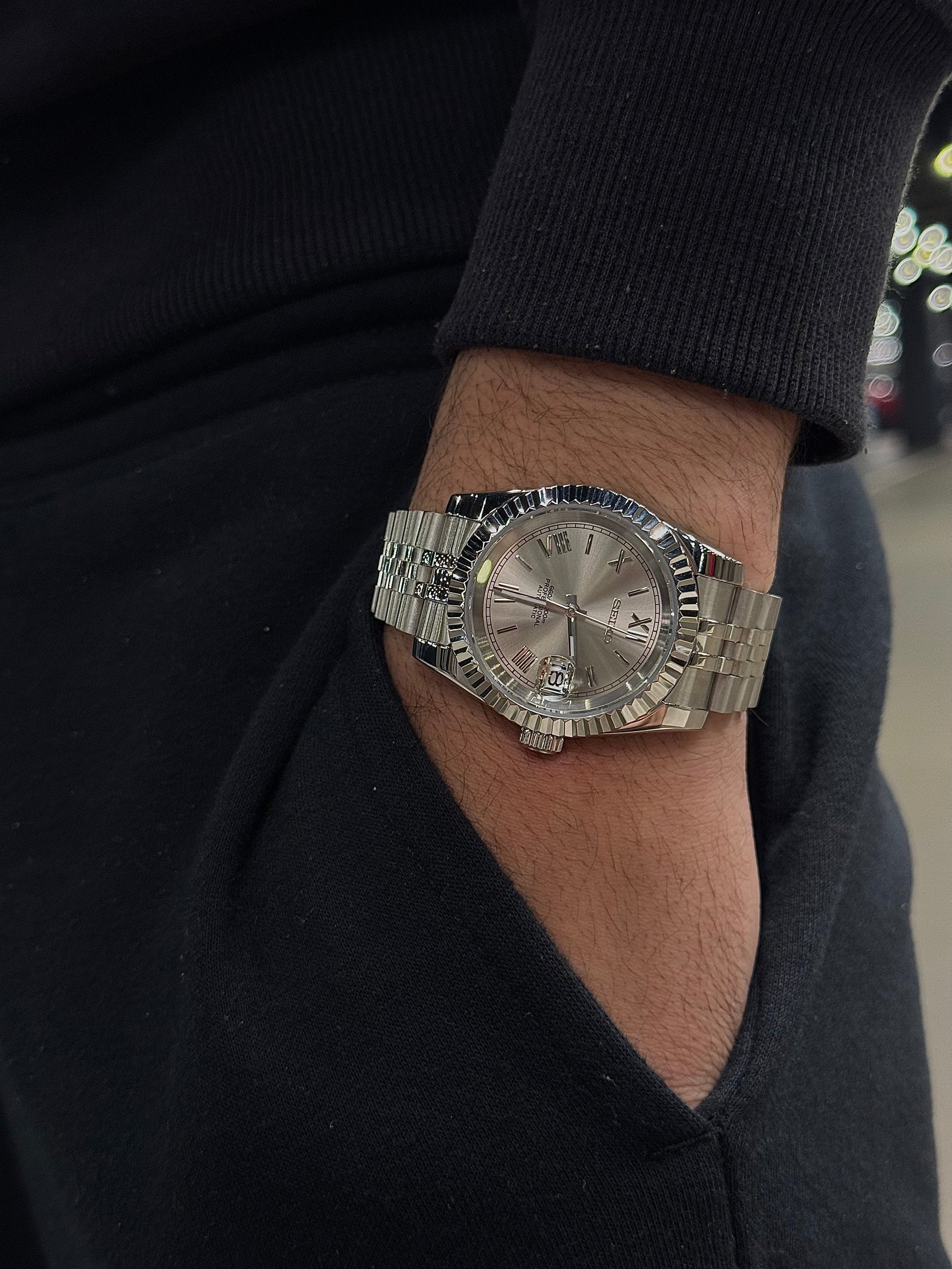 The Chrome Roman Numeral Dial watch is perfect for those who appreciate the finer things in life. Whether you’re attending a formal event or simply enjoying a night out, this watch elevates any outfit with its sophisticated charm. With its harmonious combination of chrome brilliance and classic Roman numerals, this timepiece is more than just a watch; it's a statement of style and refinement.